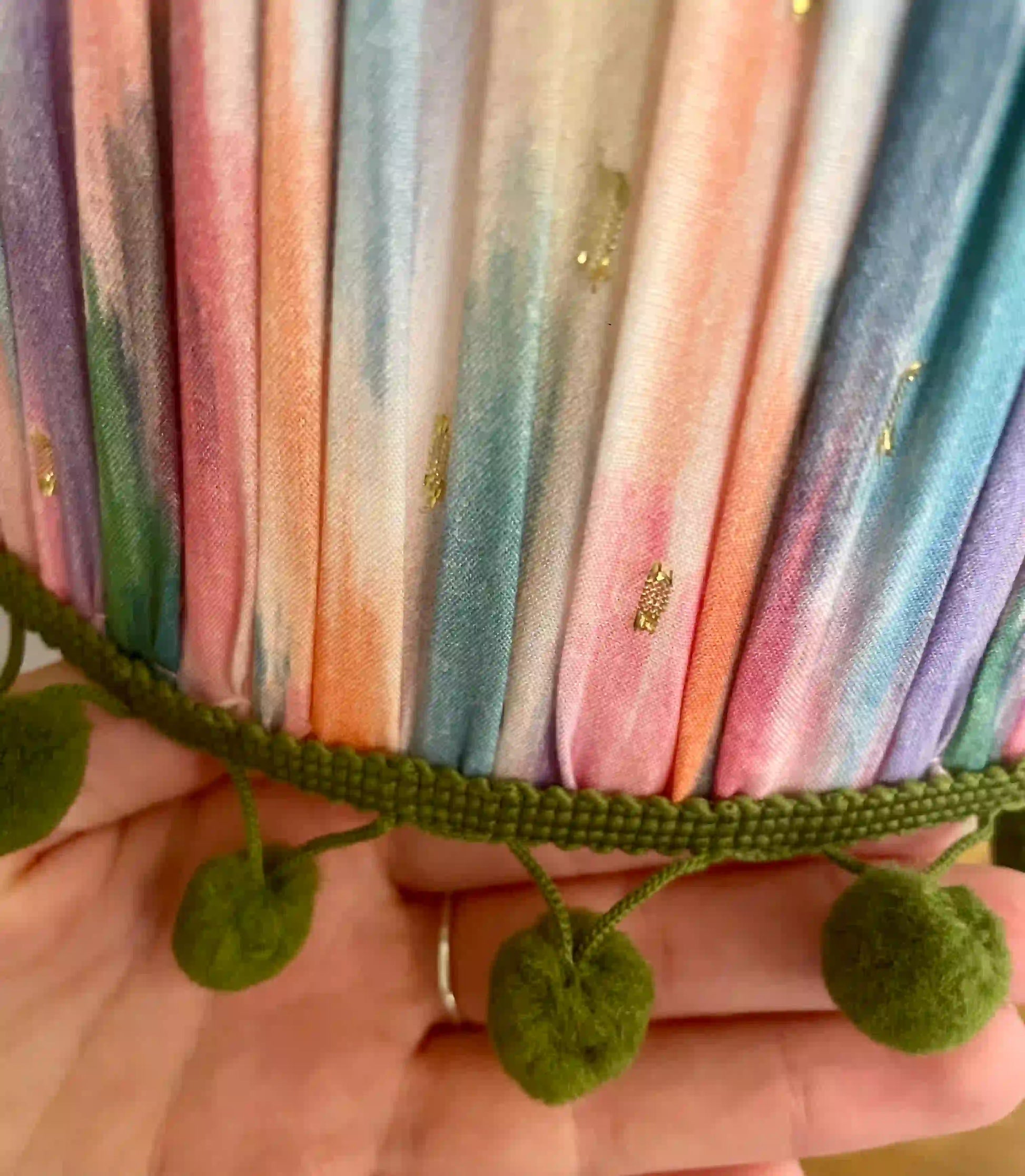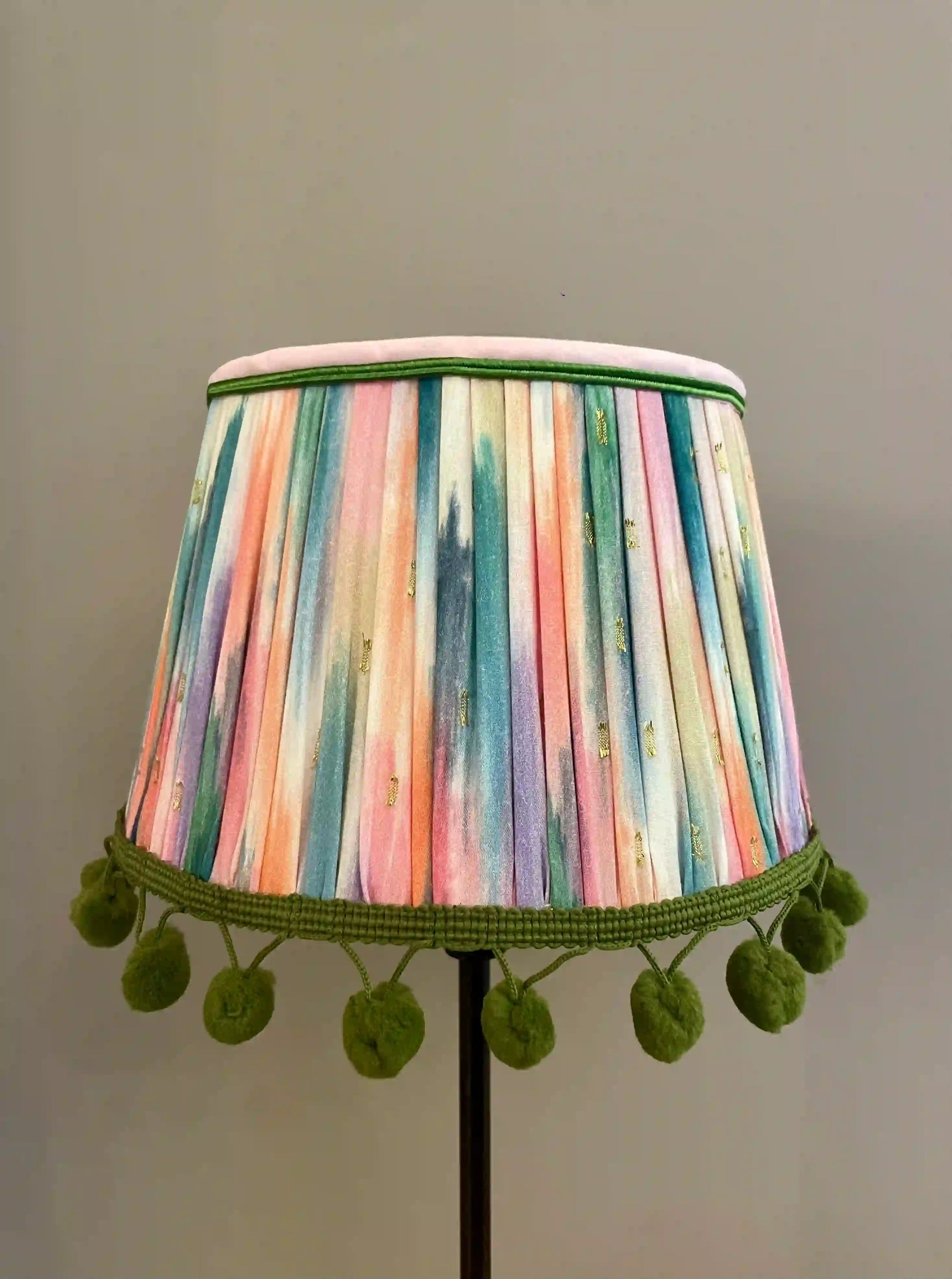 Apportez une touche poétique et raffinée à votre intérieur avec cet abat-jour tambour plissé froncé , au tissu multicolore pastel rehaussé de détails dorés .
